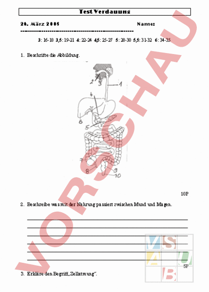 Test Verdauung 26. März 2008 Name: . 3: 16-18 3,5: 19-21 4: 22-24 4,5: 25-27 5: 28-30 5,5: 31-32 6: 34-35 1. Beschrifte die Abbildung. 10P 2. Beschreibe was mit der Nahrung passiert zwischen Mund und Magen. 5P 3. Erkläre den Begriff „Zellatmung. 2P 4. Was ist auf der Abbildung zu sehen? Welche wichtigen Vorgänge laufen hier ab? 4P 5. Nenne zwei wesentliche Aufgaben des Dickdarms. 2P 6. im Speichel zerlegt Stärke in Zucker. Pepsin im spaltet lange Eiweissketten. Der Bauchspeichel spaltet diese Eiweisse in . Auch Fett wird in und gespaltet im Dünndarm. 5P 7. Erkläre wie und wo Kohlehydrate abgebaut werden. 5P 8. Schreibe 2 Aufgaben der Nieren auf. 2P