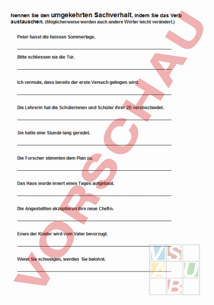 Nennen Sie den umgekehrten Sachverhalt, indem Sie das Verb austauschen. (Möglicherweise werden auch andere Wörter leicht verändert.) Peter hasst die heissen Sommertage. Bitte schliessen sie die Tür. Ich vermute, dass bereits der erste Versuch gelingen wird. Die Lehrerin hat die Schülerinnen und Schüler ihrer 2D verabschiedet. Sie hatte eine Stunde lang geredet. Die Forscher stimmten dem Plan zu. Das Haus wurde innert eines Tages aufgebaut. Die Angestellten akzeptieren ihre neue Chefin. Eines der Kinder wird vom Vater bevorzugt. Wenn Sie schweigen, werden Sie belohnt. liebt öffnen misslingen wird begrüsst geschwiegen lehnten den Plan ab abgerissen lehnen ihre neue Chefin ab benachteiligt bestraft