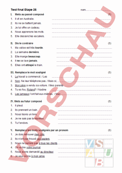 Test final Etape 26 I. nom. Mets au passé composé (5) 1. Il vit en Australie. . 2. Ils ne se battent jamais. . 3. Je lui offre un cadeau. . 4. Nous apprenons les mots. . 5. Elle descend les escaliers. . II. Dis le contraire (5) 1. Ma valise est très lourde. 2. La semaine dernière. 3. Elle mange beaucoup. 4. Il ne se lave jamais. 5. Elles ont attrapé le train. III. Remplace le mot souligné 1. Le travail commencé. Les (5) . 2. Non. Ne leur téléphone pas. Mais si, . 3. Mon père vendu sa voiture. Mes parents 4. Tu es fou, Roland? Nadine . 5. Les jumeaux lont fait eux-mêmes. Max IV. Mets au futur composé (5) 1. Il pleut. 2. Ils prennent un bain. 3. Nous lisons un livre. 4. Je ne sais pas la réponse. 5. Tu tendors. V. Remplace les mots soulignés par un pronom (6) 1. Je dois retrouver mes clés. 2. Ils nont pas trouvé ces papiers. 3. Nous ne parlons pas à tous les clients. 4. On va lire votre journal. 5. Nous avons demandé au directeur. 6. Je veux écrire à mon amie. VI. Complète les phrases par ‚jemand, ‚niemand, ‚etwas ou ‚nichts (5) midi, en ville jai mangé . froid. la gare nous avons rencontré sympathique. Dans ce journal je nai trouvé intéressant à lire. Didier est un génie; je ne connais plus intelligent que lui. Il ny . plus beau que des vacances à la mer. VII. Traduis en français (14) 1. Schreibt die Adresse mit einer schönen Schrift auf diesen Umschlag. 2. Sie ist schlecht gelaunt, weil sie keine Ahnung hat. 3. Es war nötig, zu dieser fremden Gruppe zu gehören. 4. Zahlreiche entzückende Sängerinnen haben einen schweren Irrtum begangen. 5. Ich bin nur ein durchschnittlicher Skifahrer. Ich bin nicht stolz. 6. Eine Menge Reisender haben die berühmte Ausstellung besucht. 7. Ich verspreche, dass ich nach diesem Schrecken nicht mehr lächle. MSV: Traduis en français 1. (6) Alle Zimmer gehen auf den Hof hinaus und sind geheizt. 2. Die Bastler und die Läuferinnen buchstabieren ihre Namen. 3. Die Träumerin und der Sammler sind in die Disco gegangen. 6: 5.5: 5: 4.5: 4: 3.5: 3: 43-45 40-42 37-39 33-36 29-32 25-28 21-24 MSV ab 4 P. erfüllt 090305/wa