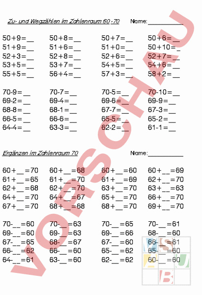 Zu- und WegzÉhlen im Zahlenraum 60 -70 Name: 509 519 523 535 555 508 516 528 537 564 507 510 526 545 573 506 5010_ 527 546 582 70-9 69-2 68-8 66-5 64-4 70-7 69-4 68-1 66-6 63-3 70-5 69-6 67-7 65-5 62-2 70-10 69-9 67-3 65-2 61-1 ErgÉnzen im Zahlenraum 70 Name: 6070 6165 6268 6470 6770 6068 6170 6270 6467 6868 6060 6169 6370 6570 6870 6069 6270 6363 6670 6970 70-60 69-60 67-65 66-62 64-61 70-63 69-63 68-67 66-60 63-60 70-65 69-66 67-60 65-62 62-62 70-61 68-60 66-61 65-60 60-60