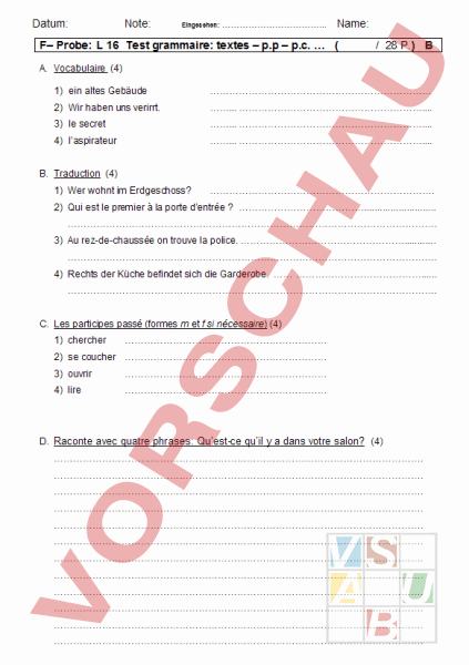 Datum: Note: Eingesehen: . Name: F– Probe: 16 Test grammaire: textes – p.p – p.c. 28 P.) A. Vocabulaire (4) 1) ein altes Gebäude 2) Wir haben uns verirrt. . 3) le secret . 4) laspirateur . B. Traduction (4) 1) Wer wohnt im Erdgeschoss? . 2) Qui est le premier à la porte dentrée . . 3) Au rez-de-chaussée on trouve la police. . 4) Rechts der Küche befindet sich die Garderobe. . C. Les participes passé (formes et si nécessaire) (4) 1) chercher 2) se coucher 3) ouvrir 4) lire D. Raconte avec quatre phrases: Quest-ce quil a dans votre salon? (4) . . . . . . . . . . . . E. Ecris le texte suivant (présent) au passé composé (4) Ils sendorment à onze heures. . Alain cache le bidon dans le cagibi. . Maman et Marie restent devant le cinéma. . Louis entre dans le café et il bois un thé. . F. Donne des réponses (avec des phrases) (4) Lappartement des Bossard combien de pièces . Quest-ce que cest un métro? . Quest-ce que les personnes boivent qui sont au salon . quelle gare les Muller sont arrivés? . G. Ecris quatre phrases avec la négation. (4) . . . . . . . . . . . .