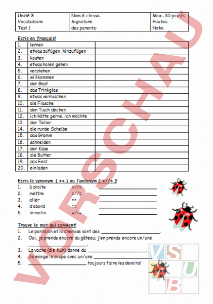 Unité 3 Vocabulaire Test 1 Ecris 1. 2. 3. 4. 5. 6. 7. 8. 9. 10. 11. 12. 13. 14. 15. 16. 17. 18. 19. 20. Nom classe: Signature des parents: Max.: 30 points Fautes: Note: en français! lernen etwas zufügen, hinzufügen kosten etwas holen gehen verstehen willkommen der Gast das Trinkglas etwas vermischen die Flasche den Tisch decken ich hätte gerne, ich möchte der Teller die runde Scheibe das Gramm schneiden der Käse die Butter das Fest einladen Ecris le synonym ou lantonym à droite // 1. 2. mettre // 3. aller dabord 4. 5. le matin // // )! Trouve le mot qui convient! 1. Le pantalon et la chemise sont des . 2. Oui, je prends encore du gâteau; jen prends encore un/une . 3. La vache (die Kuh) donne du . 4. Je mange la soupe avec un/une . 5. toujours faire les devoirs! Unité 3 Vocabulaire Test 1 Ecris 1. 2. 3. 4. 5. 6. 7. 8. 9. 10. 11. 12. 13. 14. 15. 16. 17. 18. 19. 20. Nom classe: Signature des parents: en français! lernen etwas zufügen, hinzufügen kosten etwas holen gehen verstehen willkommen der Gast das Trinkglas etwas vermischen die Flasche den Tisch decken ich hätte gerne, ich möchte der Teller die runde Scheibe das Gramm schneiden der Käse die Butter das Fest einladen Ecris le synonym ou lantonym 1. à droite // 2. mettre // 3. aller 4. dabord 5. le matin // Max.: 30 points Fautes: Note: apprendre ajouter q.ch. à q.ch coûter aller chercher q.ch. comprendre q.ch. bienvenu, bienvenue (adj.) linvité (m.), linvitée (f.) le verre mélanger q.ch la bouteille mettre la table jaimerais lassiette (f.) la rondelle le gramme couper le fromage le beurre la fête inviter // )! à gauche prendre, lever partir, sortir avant le soir, le jour, la nuit Trouve le mot qui convient! 1. Le pantalon et la chemise sont des vêtements. 2. Oui, je prends encore du gâteau; jen prends encore un/une morceau. 3. La vache (die Kuh) donne du lait. 4. Je mange la soupe avec un/une cuillère. 5. Il faut toujours faire les devoirs!