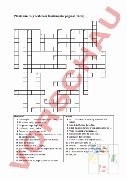 Plaids cun (Vocabulari fundamental paginas 30-38) 1 2 3 4 5 6 7 8 9 10 11 12 13 14 15 16 17 18 19 20 21 Vertical Horizontal 1 La . da contact ei rutta. Igl electricist sto 2 Cun ditg far . ha el survegniu quei che ha vuliu. vegnir. 5 El ha buca barba, mobein in bi . 2 verb da beffa (buc far beffas) 7 La gervosa vegn fatga ella 3 Il bab ha anflau lavur Cuera, aschia ston els . 8 confusiun, canera, rueida 4 Wähe (da meila, dapricosas,.) 9 Duront las vacanzas san ins far . 5 Mintga quater onns dat ei in onn . 11 Pervia da talas .(pintgas caussas) fan ins buca 6 substantiv da beinvulent da quellas caneras. 7 Va tier il coiffeur lai tagliar quella . 12 Dictaturs vegnan savens . per veta duronta. 10 Il tren per Cuera parta sil . 3 13 botta da marscha 13 Gronda . pauc ella caultscha. 16 El fa savens tut alla .(spert) 14 sbagl da tschintschar (interrupziuns), verb 17 Ses antenats han . (luvrar fetg) lentira veta ora. 15 La schuldada ha eregiu ina per serrar la via. 18 Els eran . 20 da lur onn. 19 bab, tat, . 19 lemprema carta dallas troccas 20 sinonim per buna 21 Per saver ir sur ina suga vi, drovins ina buna Sligiaziun E B E F F E I G I A R A R A B I B G A B B E E L V T D S H A B L D A I S B L S A E B R A H I B G A B T C D A L N S A A A L S H E B S C L N A B I L S I E G A R U A C A