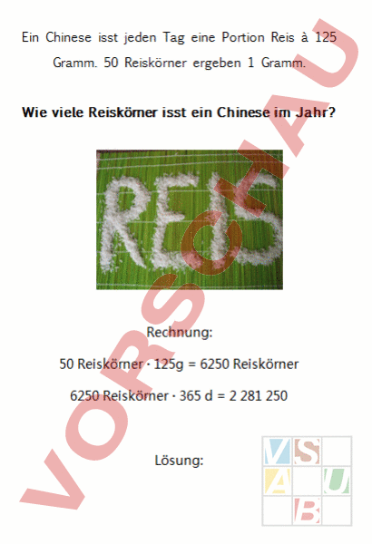 Ein Chinese isst jeden Tag eine Portion Reis à 125 Gramm. 50 Reiskörner ergeben 1 Gramm. Wie viele Reiskörner isst ein Chinese im Jahr? Rechnung: 50 Reiskörner 125g 6250 Reiskörner 6250 Reiskörner 365 2 281 250 Lösung: Ein Chinese isst im Jahr 2281250 Rieskörner im Jahr.
