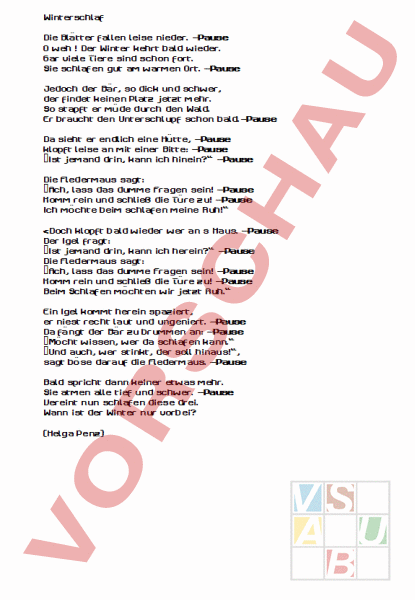 Winterschlaf Die Blätter fallen leise nieder. -Pause weh Der Winter kehrt bald wieder. Gar viele Tiere sind schon fort. Sie schlafen gut am warmen Ort. -Pause Jedoch der Bär, so dick und schwer, der findet keinen Platz jetzt mehr. So stapft er müde durch den Wald. Er braucht den Unterschlupf schon bald.-Pause Da sieht er endlich eine Hütte, -Pause klopft leise an mit einer Bitte: -Pause Ist jemand drin, kann ich hinein? -Pause Die Fledermaus sagt: Ach, lass das dumme Fragen sein! -Pause Komm rein und schließ die Türe zu! -Pause Ich möchte beim schlafen meine Ruh!