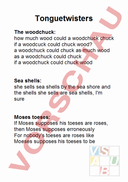 Tonguetwisters The woodchuck: how much wood could woodchuck chuck if woodcuck could chuck wood? woodchuck could chuck as much wood as woodchuck could chuck if woodchuck could chuck wood Sea shells: she sells sea shells by the sea shore and the shells she sells are sea shells, Im sure Moses toeses: If Moses supposes his toeses are roses, then Moses supposes erroneously For nobody toeses are roses like Moeses supposes his toeses to be