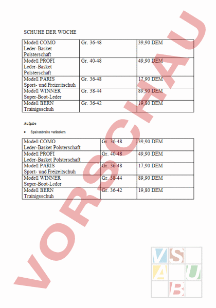 SCHUHE DER WOCHE Modell COMO Leder-Basket Polsterschaft Modell PROFI Leder-Basket Polsterschaft Modell PARIS Sport- und Freizeitschuh Modell WINNER Super-Boot-Leder Modell BERN Trainigsschuh Gr. 36-48 39,90 DEM Gr. 40-48 49,90 DEM Gr. 36-48 17,90 DEM Gr. 38-44 89,90 DEM Gr. 36-42 19,80 DEM Aufgabe • Spaltenbreite verändern Modell COMO Leder-Basket Polsterschaft Modell PROFI Leder-Basket Polsterschaft Modell PARIS Sport- und Freizeitschuh Modell WINNER Super-Boot-Leder Modell BERN Trainigsschuh Gr. 36-48 39,90 DEM Gr. 40-48 49,90 DEM Gr. 36-48 17,90 DEM Gr. 38-44 89,90 DEM Gr. 36-42 19,80 DEM • Spalte einfügen und Tabelle in der Breite wieder auf 16 cm bringen Modell COMO Leder-Basket Polsterschaft Modell PROFI Leder-Basket Polsterschaft Modell PARIS Sport- und Freizeitschuh Modell WINNER Super-Boot-Leder Modell BERN Trainigsschuh • 39,90 DEM Gr. 40-48 49,90 DEM Gr. 36-48 17,90 DEM Gr. 38-44 89,90 DEM Gr. 36-42 19,80 DEM Tabelle sortieren (Sortierkriterium Spalte 4 – Zahl – absteigend) Modell WINNER Super-Boot-Leder Modell PROFI Leder-Basket Polsterschaft Modell COMO Leder-Basket Polsterschaft Modell BERN Trainigsschuh Modell PARIS Sport- und Freizeitschuh • Gr. 36-48 Gr. 38-44 89,90 DEM Gr. 40-48 49,90 DEM Gr. 36-48 39,90 DEM Gr. 36-42 19,80 DEM Gr. 36-48 17,90 DEM Tabelle automatisch formatieren (Tabelle markieren – Auswahl 3 D-Effekt3 Modell WINNER Super-Boot-Leder Modell PROFI Leder-Basket Polsterschaft Modell COMO Leder-Basket Polsterschaft Modell BERN Trainigsschuh Modell PARIS Sport- und Freizeitschuh Gr. 38-44 89,90 DEM Gr. 40-48 49,90 DEM Gr. 36-48 39,90 DEM Gr. 36-42 19,80 DEM Gr. 36-48 17,90 DEM