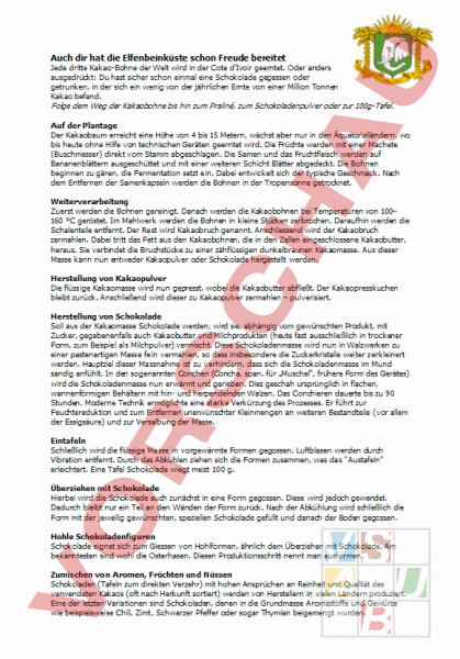 Auch dir hat die Elfenbeinküste schon Freude bereitet Jede dritte Kakao-Bohne der Welt wird in der Cote dIvoir geerntet. Oder anders ausgedrückt: Du hast sicher schon einmal eine Schokolade gegessen oder getrunken, in der sich ein wenig von der jährlichen Ernte von einer Million Tonnen Kakao befand. Folge dem Weg der Kakaobohne bis hin zum Praliné, zum Schokoladenpulver oder zur 100g-Tafel. Auf der Plantage Der Kakaobaum erreicht eine Höhe von 4 bis 15 Metern, wächst aber nur in den Äquatorialländern, wo bis heute ohne Hilfe von technischen Geräten geerntet wird. Die Früchte werden mit einer Machete (Buschmesser) direkt vom Stamm abgeschlagen. Die Samen und das Fruchtfleisch werden auf Bananenblättern ausgeschüttet und mit einer weiteren Schicht Blätter abgedeckt. Die Bohnen beginnen zu gären, die Fermentation setzt ein. Dabei entwickelt sich der typische Geschmack. Nach dem Entfernen der Samenkapseln werden die Bohnen in der Tropensonne getrocknet. Weiterverarbeitung Zuerst werden die Bohnen gereinigt. Danach werden die Kakaobohnen bei Temperaturen von 100– 160 C geröstet. Im Mahlwerk werden die Bohnen in kleine Stücken zerbrochen. Daraufhin werden die Schalenteile entfernt. Der Rest wird Kakaobruch genannt. Anschliessend wird der Kakaobruch zermahlen. Dabei tritt das Fett aus den Kakaobohnen, die in den Zellen eingeschlossene Kakaobutter, heraus. Sie verbindet die Bruchstücke zu einer zähflüssigen dunkelbraunen Kakaomasse. Aus dieser Masse kann nun entweder Kakaopulver oder Schokolade hergestellt werden. Herstellung von Kakaopulver Die flüssige Kakaomasse wird nun gepresst, wobei die Kakaobutter abfließt. Der Kakaopresskuchen bleibt zurück. Anschließend wird dieser zu Kakaopulver zermahlen – pulverisiert. Herstellung von Schokolade Soll aus der Kakaomasse Schokolade werden, wird sie, abhängig vom gewünschten Produkt, mit Zucker, gegebenenfalls auch Kakaobutter und Milchprodukten (heute fast ausschließlich in trockener Form, zum Beispiel als Milchpulver) vermischt. Diese Schokoladenmasse wird nun in Walzwerken zu einer pastenartigen Masse fein vermahlen, so dass insbesondere die Zuckerkristalle weiter zerkleinert werden. Hauptziel dieser Massnahme ist zu verhindern, dass sich die Schokoladenmasse im Mund sandig anfühlt. In den sogenannten Conchen (Concha, span. für „Muschel, frühere Form des Gerätes) wird die Schokoladenmasse nun erwärmt und gerieben. Dies geschah ursprünglich in flachen, wannenförmigen Behältern mit hin- und herpendelnden Walzen. Das Conchieren dauerte bis zu 90 Stunden. Moderne Technik ermöglichte eine starke Verkürzung des Prozesses. Er führt zur Feuchtereduktion und zum Entfernen unerwünschter Kleinmengen an weiteren Bestandteile (vor allem der Essigsäure) und zur Versalbung der Masse. Eintafeln Schließlich wird die flüssige Masse in vorgewärmte Formen gegossen. Luftblasen werden durch Vibration entfernt. Durch das Abkühlen ziehen sich die Formen zusammen, was das Austafeln erleichtert. Eine Tafel Schokolade wiegt meist 100 g. Überziehen mit Schokolade Hierbei wird die Schokolade auch zunächst in eine Form gegossen. Diese wird jedoch gewendet. Dadurch bleibt nur ein Teil an den Wänden der Form zurück. Nach der Abkühlung wird schließlich die Form mit der jeweilig gewünschten, speziellen Schokolade gefüllt und danach der Boden gegossen. Hohle Schokoladenfiguren Schokolade eignet sich zum Giessen von Hohlformen, ähnlich dem Überziehen mit Schokolade. Am bekanntesten sind wohl die Osterhasen. Diesen Produktionsschritt nennt man ausformen. Zumischen von Aromen, Früchten und Nüssen Schokoladen (Tafeln zum direkten Verzehr) mit hohen Ansprüchen an Reinheit und Qualität des verwendeten Kakaos (oft nach Herkunft sortiert) werden von Herstellern in vielen Ländern produziert. Eine der letzten Variationen sind Schokoladen, denen in die Grundmasse Aromastoffe und Gewürze wie beispielsweise Chili, Zimt, Schwarzer Pfeffer oder sogar Thymian beigemengt wurden.