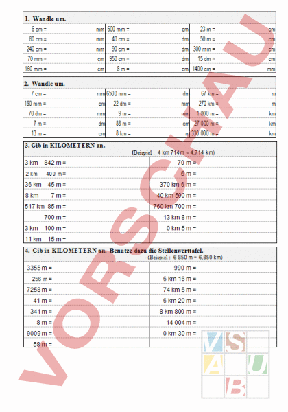 1. Wandle um. 6 cm mm 600 mm cm 23 cm 80 cm mm 40 cm dm 50 cm 240 cm mm 90 cm dm 300 mm cm 70 mm cm 950 cm dm 15 dm cm cm cm 1400 cm mm 160 mm 8m 2. Wandle um. 7 cm mm 6500 mm dm 67 km 160 mm cm 22 dm mm 270 km 70 dm mm 9m mm 1 000 km 7m dm 88 cm 27 000 km 13 cm 8 km 330 000 km 3. Gib in KILOMETERN an. (Beispiel 4 km 714m 4,714 km) 3 km 842 70 2 km 400 5m 36 km 45 370 km 6 8 km 7m 40 km 590 517 km 85 760 km 700 700 13 km 8 3 km 100 0 km 5 11 km 15 4. Gib in KILOMETERN an. Benutze dazu die Stellenwerttafel. (Beispiel 6 850 6,850 km) 3355 990 256 6 km 16 7258 74 km 5 41 6 km 20 341 8 km 800 8m 14 004 9009 0 km 30 58