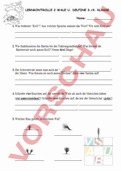 LERNKONTROLLE 2 WALE U. DELFINE 3./4. KLASSE Name: 1. Was bedeutet Krill? Aus welcher Sprache stammt das Wort? Wie sieht Krill aus? , , 2. Wie funktionieren die Barten bei der Nahrungsaufnahme? Was fressen die Bartenwale noch ausser Krill? Nenne drei Dinge! , , 3. Die Schwertwale nennt man auch die der Meere. Was fressen sie noch ausser Fischen? Zähle vier Sachen auf! , , 4. Schreibe vier Knochen auf, die sowohl die Wale als auch die Menschen haben (rot unterstreichen!)! Schreibe zwei Knochen auf, die nur der Mensch hat. (grün!) , , , , 5. Welcher Blas gehört zu welchem Wal? 6. Bevor der Wal Luft holt, muss er . Bei den Bartenwalen geschieht das durch Nasenlöcher. Die Zahnwale haben nur. Die Blaslöcher sind dicht verschlossen, wenn der Wal abtaucht, damit kein Wasser in die dringt. Beim Schlafen haben sie immer offen, damit sie nicht ertrinken. 7. Nummeriere die folgenden vier Sätze in der richtigen Reihenfolge: Sofort nach der Geburt dreht sich die Mutter rasch um, um die Nabelschnur zu zerreissen. Mit dem Kopf schubst die Mutter das Kalb an die Wasseroberfläche. Das Kalb kommt mit der Schwanzflosse voran zur Welt. Das Neugeborene hat keine Luft in den Lungen und sinkt deshalb ab. 8. Wale und Delfine leben häufig in Gruppen. Man nennt diese Gruppen oder. Nenne zwei Vorteile, die solche Gruppen haben! 9. Zähle vier Produkte auf, die aus Walrohstoffen hergestellt werden., , , 10. Welche zwei Länder betreiben heute noch Walfang (auf geschützte Tiere) trotz Verbot?, 11. Nenne die Namen der Wale mit den folgenden Rekorden! Die längsten Barten: Der kleinste Wal: Am längsten tauchen: Die grösste Wanderung: Die höchste Finne: Der beste Sänger: LÖSUNGEN 2 WALE U. DELFINE 3./4. KLASSE Name: 1. Was bedeutet Krill? Aus welcher Sprache stammt das Wort? Wie sieht Krill aus? Kleiner Fisch, aus dem Norwegischen, rötlicher Kleinkrebs, etwa 5 cm lang 3 2. Wie funktionieren die Barten bei der Nahrungsaufnahme? Was fressen die Bartenwale noch ausser Krill? Nenne drei Dinge! Wie ein Sieb, Plankton, Weichtierchen, kleine Fische 4 3. Die Schwertwale nennt man auch die Gesundheitspolizei der Meere. Was fressen sie noch ausser Fischen? Zähle vier Sachen auf! Kranke, schwache Tiere, Robben, Vögel, Delfine, andere Wale 4 4. Schreibe vier Knochen auf, die sowohl die Wale als auch die Menschen haben (rot unterstreichen!)! Schreibe zwei Knochen auf, die nur der Mensch hat. (grün!) Schädel, Kiefer, Halswirbel, Rippen, Schulterblatt, Arme, Finger, Becken Oberschenkel, Fuss, Schien- u. Wadenbein 6 5. Welcher Blas gehört zu welchem Wal? Zwergwal Pottwal Blauwal Glattwal Buckelwal 5 6. Bevor der Wal Luft holt, muss er ausatmen. Bei den Bartenwalen geschieht das durch zwei Nasenlöcher. Die Zahnwale haben nur eines. Die Blaslöcher sind dicht verschlossen, wenn der Wal abtaucht, damit kein Wasser in die Lungen dringt. Beim Schlafen haben sie immer ein Auge offen, damit sie nicht ertrinken. 6 7. Nummeriere die folgenden vier Sätze in der richtigen Reihenfolge: 2 Sofort nach der Geburt dreht sich die Mutter rasch um, um die Nabelschnur zu zerreissen. 4 Mit dem Kopf schubst die Mutter das Kalb an die Wasseroberfläche. 1 Das Kalb kommt mit der Schwanzflosse voran zur Welt. 3 Das Neugeborene hat keine Luft in den Lungen und sinkt deshalb ab. 4 8. Wale und Delfine leben häufig in Gruppen. Man nennt diese Gruppen Schulen oder Herden. Nenne zwei Vorteile, die solche Gruppen haben! Besserer Schutz der Jungen, und auch gegenseitig, gut behütet, Hilfe für Schwache und Kranke, gemeinsam stärker. 4 9. Zähle vier Produkte auf, die aus Walrohstoffen hergestellt werden. Tierfutter, Dünger, Schmiermittel, Leim, Seife, Lebertran, Gelatine, Salben Margarine, Farbstifte, Lippenstift, Filme, Fotopapier, Schuhcreme etc. 4 10. Welche zwei Länder betreiben heute noch Walfang (auf geschützte Tiere) trotz Verbot? Japan, Norwegen, ev. Island 2 11. Nenne die Namen der Wale mit den folgenden Rekorden! Die längsten Barten: Grönlandwal Der kleinste Wal: Hector Delfin Am längsten tauchen: Entenwal Die grösste Wanderung: Grauwal Die höchste Finne: Schwertwal Der beste Sänger: Buckelwal 6 48