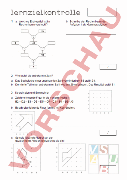 1 a. Welches Endresultat ist im Rechenbaum versteckt? b. Schreibe den Rechenbaum der Aufgabe 1 als Klammeraufgabe! 2 Wie lautet die unbekannte Zahl? a. Das Sechsfache einer unbekannten Zahl vermindert um 68 ergibt 34. b. Der vierte Teil einer unbekannten Zahl wird um 29 vergrössert. Das Resultat ergibt 81. 3 Koordinaten und Symmetrien a. Zeichne folgende Figur in die Vorlage (rechts): B2 – D2 – E3 – D3 – D5 – C5 – C4 – B4 – B3– A3 b. Beschreibe folgende Figur (unten) mit Koordinaten: c. Spiegle folgende Figuren an den gezeichneten Achsen und zeichne sie ein! 4 Runde die Zahlen in der Tabelle. Runde .auf Zehner .auf Einer .auf Zehntel .auf Hundertstel 556,374 1004,505 789,888 5 Brüche a. Löse mit dem Rechtecksmodell. Schreibe auch das Resultat hin! 3 b. Entscheide, ob der Unterschied grösser oder kleiner ist als 1 ist. Bestimme dann den Unterschied genau! 5 1 6. Wie gross sind die Flächen? 8m 13m 9m 17m 3m 12m A: B:
