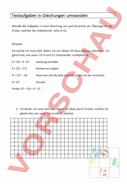 Textaufgaben in Gleichungen umwandeln Wandle die Aufgaben in eine Gleichung um und berechne sie. Überlege dir als Erstes, welches die Unbekannte (also x) ist. Beispiel: Ich merke mir eine Zahl. Wenn ich von dieser 50 dazu rechne, bekomme ich gleich viel, wie wenn ich 9 und 13 miteinander multipliziere. 50 9 13 Gleichung aufstellen 50 117 Rechnen wo möglich 117 – 50 Wenn eine Zahl die Seite wechselt, ändert sich das Vorzeichen 67 Resultat Probe: 67 50 9 13 1. Ich denke mir eine Zahl aus. Wenn ich diese durch 4 teile, erhalte ich gleich viel, wie wenn ich 6 von 31 abziehe. 2. Max wiegt 47 Kg und Manuela 45 Kg. Zusammen sind sie gleich schwer wie Daniela und Roman, der 55 Kg wiegt. Wie schwer ist Daniela. 3. Wenn Herr Kübli sein Geld verdreifachen könnte, hätte er immer noch 500.- Fr. weniger als sein Nachbar Herr Rütsche. Herr Rütsche hat 2000.- Fr. Wie viel Geld hat Herr Kübli im Moment? 4. Ich denke mir eine Zahl. Wenn ich 5 dazu zähle und das Produkt mit 8 multipliziere, erhalte ich das Gleiche, wie wenn ich 140 halbiere und noch 2 dazu addiere.