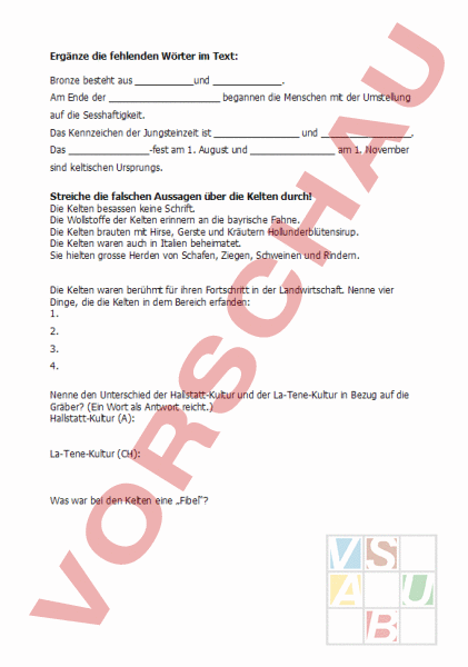 Ergänze die fehlenden Wörter im Text: Bronze besteht ausund. Am Ende der begannen die Menschen mit der Umstellung auf die Sesshaftigkeit. Das Kennzeichen der Jungsteinzeit ist und. Das-fest am 1. August und am 1. November sind keltischen Ursprungs. Streiche die falschen Aussagen über die Kelten durch! Die Kelten besassen keine Schrift. Die Wollstoffe der Kelten erinnern an die bayrische Fahne. Die Kelten brauten mit Hirse, Gerste und Kräutern Hollunderblütensirup. Die Kelten waren auch in Italien beheimatet. Sie hielten grosse Herden von Schafen, Ziegen, Schweinen und Rindern. Die Kelten waren berühmt für ihren Fortschritt in der Landwirtschaft. Nenne vier Dinge, die die Kelten in dem Bereich erfanden: 1. 2. 3. 4. Nenne den Unterschied der Hallstatt-Kultur und der La-Tene-Kultur in Bezug auf die Gräber? (Ein Wort als Antwort reicht.) Hallstatt-Kultur (A): La-Tene-Kultur (CH): Was war bei den Kelten eine „Fibel?