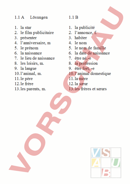1.1 Lösungen 1. la star 2. le film publicitaire 3. présenter 4. lanniversaire, 5. le prénom 6. la naissance 7. le lieu de naissance 8. les loisirs, m. 9. la langue 10. lanimal, m. 11. le père 12. le frère 13. les parents, m. 1.1 1. la publicité 2. lannonce, f. 3. habiter 4. le nom 5. le nom de famille 6. la date de naissance 7. être né,-e 8. la profession 9. être fort, -e 10. lanimal domestique 11. la mère 12. la sœur 13. les frères et sœurs