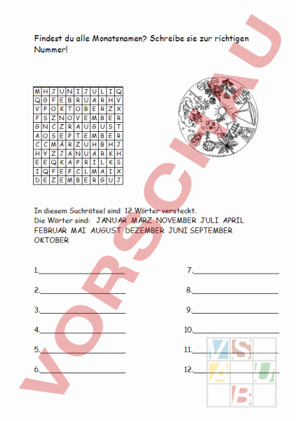 Findest du alle Monatsnamen? Schreibe sie zur richtigen Nummer! Q F A H I G S O Y Q F Z S Z F E N E Ä K E B O P A P R V T N C U E E U L A M M A M R B B R A H E E K I V R R H X In diesem Suchrätsel sind 12 Wörter versteckt. Die Wörter sind: JANUAR MÄRZ NOVEMBER JULI APRIL FEBRUAR MAI AUGUST DEZEMBER JUNI SEPTEMBER OKTOBER 1._ 7._ 2._ 8._ 3._ 9._ 4._ 10._ 5._ 11._ 6._ 12._