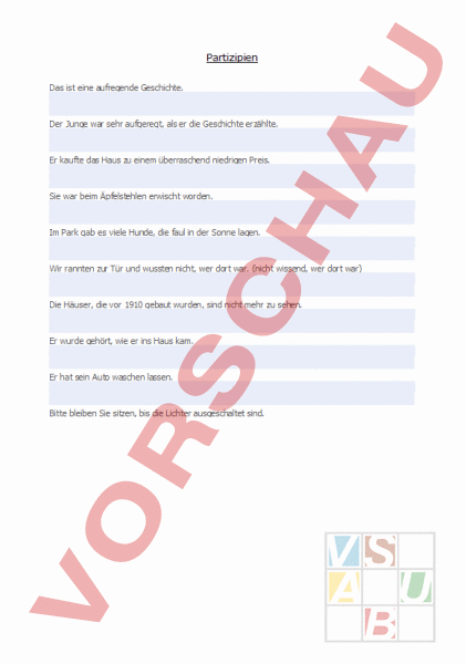 Partizipien Das ist eine aufregende Geschichte. Der Junge war sehr aufgeregt, als er die Geschichte erzählte. Er kaufte das Haus zu einem überraschend niedrigen Preis. Sie war beim Äpfelstehlen erwischt worden. Im Park gab es viele Hunde, die faul in der Sonne lagen. Wir rannten zur Tür und wussten nicht, wer dort war. (nicht wissend, wer dort war) Die Häuser, die vor 1910 gebaut wurden, sind nicht mehr zu sehen. Er wurde gehört, wie er ins Haus kam. Er hat sein Auto waschen lassen. Bitte bleiben Sie sitzen, bis die Lichter ausgeschaltet sind.