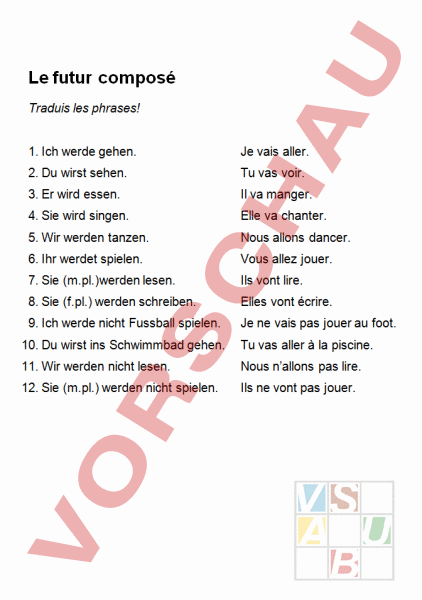 Le futur composé Traduis les phrases! 1. Ich werde gehen. Je vais aller. 2. Du wirst sehen. Tu vas voir. 3. Er wird essen. Il va manger. 4. Sie wird singen. Elle va chanter. 5. Wir werden tanzen. Nous allons dancer. 6. Ihr werdet spielen. Vous allez jouer. 7. Sie (m.pl.)werden lesen. Ils vont lire. 8. Sie (f.pl.) werden schreiben. Elles vont écrire. 9. Ich werde nicht Fussball spielen. Je ne vais pas jouer au foot. 10. Du wirst ins Schwimmbad gehen. Tu vas aller à la piscine. 11. Wir werden nicht lesen. Nous nallons pas lire. 12. Sie (m.pl.) werden nicht spielen. Ils ne vont pas jouer.