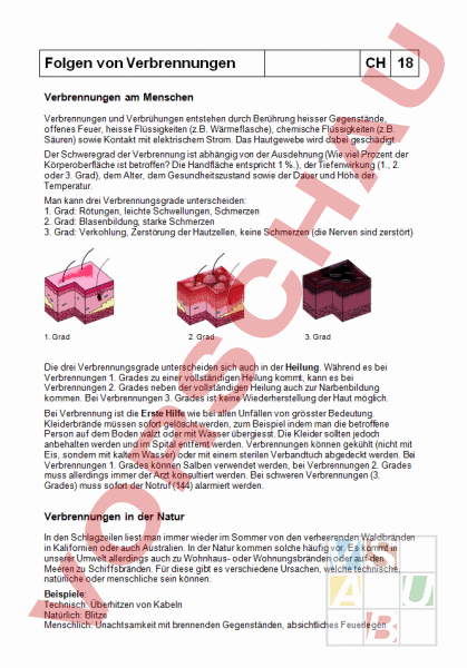 Folgen von Verbrennungen CH 18 Verbrennungen am Menschen Verbrennungen und Verbrühungen entstehen durch Berührung heisser Gegenstände, offenes Feuer, heisse Flüssigkeiten (z.B. Wärmeflasche), chemische Flüssigkeiten (z.B. Säuren) sowie Kontakt mit elektrischem Strom. Das Hautgewebe wird dabei geschädigt. Der Schweregrad der Verbrennung ist abhängig von der Ausdehnung (Wie viel Prozent der Körperoberfläche ist betroffen? Die Handfläche entspricht 1 %.), der Tiefenwirkung (1., 2. oder 3. Grad), dem Alter, dem Gesundheitszustand sowie der Dauer und Höhe der Temperatur. Man kann drei Verbrennungsgrade unterscheiden: 1. Grad: Rötungen, leichte Schwellungen, Schmerzen 2. Grad: Blasenbildung, starke Schmerzen 3. Grad: Verkohlung, Zerstörung der Hautzellen, keine Schmerzen (die Nerven sind zerstört) 1. Grad 2. Grad 3. Grad Die drei Verbrennungsgrade unterscheiden sich auch in der Heilung. Während es bei Verbrennungen 1. Grades zu einer vollständigen Heilung kommt, kann es bei Verbrennungen 2. Grades neben der vollständigen Heilung auch zur Narbenbildung kommen. Bei Verbrennungen 3. Grades ist keine Wiederherstellung der Haut möglich. Bei Verbrennung ist die Erste Hilfe wie bei allen Unfällen von grösster Bedeutung. Kleiderbrände müssen sofort gelöscht werden, zum Beispiel indem man die betroffene Person auf dem Boden wälzt oder mit Wasser übergiesst. Die Kleider sollten jedoch anbehalten werden und im Spital entfernt werden. Verbrennungen können gekühlt (nicht mit Eis, sondern mit kaltem Wasser) oder mit einem sterilen Verbandtuch abgedeckt werden. Bei Verbrennungen 1. Grades können Salben verwendet werden, bei Verbrennungen 2. Grades muss allerdings immer der Arzt konsultiert werden. Bei schweren Verbrennungen (3. Grades) muss sofort der Notruf (144) alarmiert werden. Verbrennungen in der Natur In den Schlagzeilen liest man immer wieder im Sommer von den verheerenden Waldbränden in Kalifornien oder auch Australien. In der Natur kommen solche häufig vor. Es kommt in unserer Umwelt allerdings auch zu Wohnhaus- oder Wohnungsbränden oder auf den Meeren zu Schiffsbränden. Für diese gibt es verschiedene Ursachen, welche technische, natürliche oder menschliche sein können. Beispiele: Technisch: Überhitzen von Kabeln Natürlich: Blitze Menschlich: Unachtsamkeit mit brennenden Gegenständen, absichtliches Feuerlegen Aufgabe: Fülle den Lückentext mit Hilfe des Textes (1. Seite) aus. Verbrennungen am Menschen Im Alltag kann es in den folgenden Fällen zu Verbrennungen kommen: Das Alter des Betroffenen spielt dabei eine grosse Rolle. Verbrennungen 1. Grades: Heilung: Verbrennungen 2. Grades: Heilung: Verbrennungen 3. Grades: Heilung: Erste Hilfe: Verbrennungen in der Umwelt Brände können unterschiedliche Ursachen haben und an verschiedenen Orten vorkommen. Ursachen: Brandorte: Besonders Waldbrände können verheerend sein und erscheinen im Sommer oft in den Schlagzeilen (z.B. ).