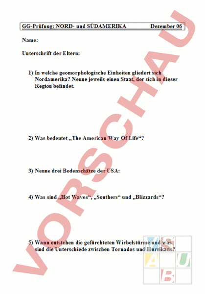 GG-Prüfung: NORD- und SÜDAMERIKA Dezember 06 Name: Unterschrift der Eltern: 1) In welche geomorphologische Einheiten gliedert sich Nordamerika? Nenne jeweils einen Staat, der sich in dieser Region befindet. 2) Was bedeutet „The American Way Of Life? 3) Nenne drei Bodenschätze der USA: 4) Was sind „Hot Waves, „Southers und „Blizzards? 5) Wann entstehen die gefürchteten Wirbelstürme und was sind die Unterschiede zwischen Tornados und Hurrikans? 6) 7) 8) a) Markiere farbig alle Staaten, die zum Westen der USA gehören. b) Markiere farbig alle Staaten der USA, die zum Süden gehören. c) Zähle die mittleren Atlantikstaaten auf.