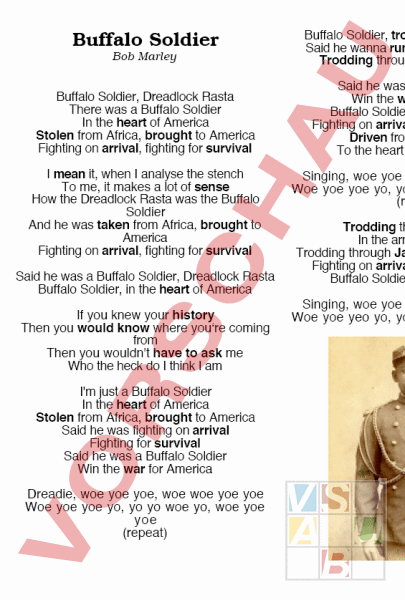 Bob Marley Buffalo Soldier, trodding through the land Said he wanna run, then you wanna hand Trodding through the land, yea, yea Buffalo Soldier, Dreadlock Rasta There was Buffalo Soldier In the heart of America Stolen from Africa, brought to America Fighting on arrival, fighting for survival Said he was Buffalo Soldier Win the war for America Buffalo Soldier, Dreadlock Rasta Fighting on arrival, fighting for survival Driven from the mainland To the heart of the Caribbean Buffalo Soldier mean it, when analyse the stench To me, it makes lot of sense How the Dreadlock Rasta was the Buffalo Soldier And he was taken from Africa, brought to America Fighting on arrival, fighting for survival Said he was Buffalo Soldier, Dreadlock Rasta Buffalo Soldier, in the heart of America If you knew your history Then you would know where you‘re coming from Then you wouldnt have to ask me Who the heck do think am Im just Buffalo Soldier In the heart of America Stolen from Africa, brought to America Said he was fighting on arrival Fighting for survival Said he was Buffalo Soldier Win the war for America Dreadie, woe yoe yoe, woe woe yoe yoe Woe yoe yoe yo, yo yo woe yo, woe yoe yoe (repeat) Singing, woe yoe yoe, woe woe yoe yoe Woe yoe yoe yo, yo yo woe yo woe yo yoe (repeat) Trodding through San Juan In the arms of America Trodding through Jamaica, Buffalo Soldier Fighting on arrival, fighting for survival Buffalo Soldier, Dreadlock Rasta Singing, woe yoe yoe, woe woe yoe yoe Woe yoe yeo yo, yo yo woe yo woe yo yoe Buffalo Soldier — Bob Marley arrival arrival buffalo Caribbean heart mainland stench survival to analyse to bring brought -brought to drive drove -driven sb away to fight fought fought to make made made sense to make sense to mean -meant meant to steal stole stolen to trod Who the heck Buffalo Soldier, Dreadlock Rasta There was Buffalo Soldier In the of America from Africa, to America Fighting on , fighting for it, when analyse the stench To me, it makes lot of How the Dreadlock Rasta was the Buffalo Soldier And he was from Africa, to America Fighting on , fighting for Said he was Buffalo Soldier, Dreadlock Rasta Buffalo Soldier, in the of America If you knew your Then you where you‘re coming from Then you wouldnt me Who the heck do think am Im just Buffalo Soldier In the of America from Africa, to America Said he was fighting on Fighting for Said he was Buffalo Soldier Win the for America arrival arrival Dreadie, woe yoe yoe, woe woe yoe yoe Woe yoe yoe yo, yo yo woe yo, woe yoe yoe (repeat) buffalo Caribbean heart Buffalo Soldier, through the land Said he wanna , then you wanna hand through the land, yea, yea mainland stench survival to analyse Said he was Buffalo Soldier Win the for America Buffalo Soldier, Dreadlock Rasta Fighting on , fighting for from the mainland To the heart of the Singing, woe yoe yoe, woe woe yoe yoe Woe yoe yoe yo, yo yo woe yo woe yo yoe (repeat) to bring brought -brought to drive drove -driven sb away to fight fought fought to make made made sense to make sense to mean -meant meant to steal stole stolen through San Juan In the arms of America Trodding through , Buffalo Soldier Fighting on , fighting for Buffalo Soldier, Dreadlock Rasta Singing, woe yoe yoe, woe woe yoe yoe Woe yoe yeo yo, yo yo woe yo woe yo yoe to trod Who the heck