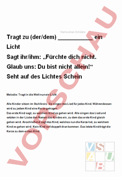 Name eines Schülers Tragt zu (der/dem) ein Licht Sagt ihr/ihm: „Fürchte dich nicht. Glaub uns: Du bist nicht allein! Seht auf des Lichtes Schein Melodie: Tragt in die Welt nun ein Licht Alle Kinder sitzen im Stuhlkreis. Sie singen das Lied für jedes Kind. Währendessen wird zu jedem Kind eine Kerze getragen. Das erste Kind sagt, zu welchem Kind es gehen wird. Alle singen das Lied und setzten in der Lücke den Namen das Kindes ein, zu dem das erste Kind gleich gehen wird. Anschließend sagt das Kind, welches nun die Kerze hat, zu welchem Kind es gehen wird. Kein Kind soll doppelt dran kommen. Das letzte Kind trägt die Kerze zu dem ersten Kind.