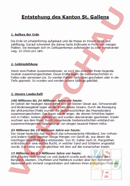 Entstehung des Kanton St. Gallens 1. Aufbau der Erde Die Erde ist schalenförmig aufgebaut und die Masse im Innern heiss und zähflüssig. Darauf schwimmt die dünne harte Erdkruste in Form von riesigen Platten. Sie bewegen sich im Zeitlupentempo aufeinander zu oder voneinander weg, 10-20cm pro Jahr. 2. Gebirgsbildung Wenn zwei Platten zusammenstossen, so wird das zwischen ihnen liegende Gestein zusammengeschoben. Diese Kräfte legen die Gesteinsschichten in Falten oder zerreissen sie. So werden Pakete nach oben geschoben oder in die Tiefe gepresst. So wurden und werden unsere Gebirge gebildet. 3. Unsere Landschaft 100 Millionen bis 24 Millionen Jahre vor heute: Im Gebiet der heutigen Alpen dehnt sich ein kleiner Ozean aus. Schwarzwald und Bodenseegebiet lagen an der Küste dieses Ozeans. Durch die Bewegung der afrikanischen Platte wurden die Gesteinsschichten des Meeresbodens zusammengeschoben. Der Raum wurde enger, die oberen Schichten legten sich in Falten. Andere zerbrachen und wurden übereinander geschoben. Inseln wuchsen aus dem Meer. Durch vorrückende Gesteinsschichten entstand ein zusammenhängendes Alpengebirge von einigen tausend Metern Höhe. 25 Millionen bis 10 Millionen Jahre vor heute: Der Ozean bedeckte nun nur noch das schweizerische Mittelland. Der Urrhein und andere Flüsse lagerten riesige Mengen von Geröll ab, aus denen die mächtigen Nagelfluhbänke entstanden. Von St. Gallen nach St. Margrethen erstreckte sich eine seichte Bucht, in welcher Sand und Schlamm angesetzt wurde. Das Klima war vergleichbar mit dem auf den Kanarischen Inseln. 15 Millionen bis 2,5 Millionen Jahre vor heute: Afrika rückte noch einmal vor und dadurch wurde auch das Vorland zum Bergland. Alpstein, Churfisten und Mattstock wurden über den damaligen Alpenrand aufs Vorland vorgeschoben und nahmen ihren endgültigen Platz ein. 7 Millionen bis 2 Millionen Jahre vor heute: Von dieser Zeit weiss man sehr wenig, weil die Spuren verwischt wurden. Das ganze St. Gallerland war zum Bergland geworden, das Vorland zum Hochland. Aus diesen Bergen suchten sich die Flüsse einen Weg zum Meer. Dadurch entstanden beispielsweise das Sitter- oder Goldachtobel, die Taminaschlucht. 2,5 Millionen bis 10 000 Jahre vor heute. Eiszeitalter, Hobelarbeit der Gletscher! Wo vorher alpine Matten grünten, bildeten sich Gletscher, bestehende Gletscher wurden mächtiger. Schliesslich stiessen sie bis ins Flachland vor und breiteten sich fladenartig aus. Jede Eiszeit dauerte ungefähr 100 000 Jahre. Dazwischen erwärmte sich das Klima auf Werte, die mit dem heutigen vergleichbar sind. Dieses Spiel wiederholte sich zehn- bis zwanzig Mal. Somit können wir annehmen, dass wir heute in einer Zwischeneiszeit leben. Während der letzten Eiszeit (110 000 – 10 000 vor heute) reichte der Rheingletscher bis nach Schaffhausen. Nur die höchsten Berge ragten über den Eispanzer, der Eispanzer war 1000 bis 1800 Meter dick. Das Rheintal wurde um etliche hundert Meter ausgebaggert und bis auf zehn Kilometer Breite ausgeweitet, der Bodensee wurde ausgeschürft. Andere Ebenen wurden ebenfalls durch das Eis geschaffen. 10 000 Jahre bis heute: Die Einöde wird begrünt. Weite Teile waren mit Wasser angefüllt. Die Flüsse transportierten ungeheure Mengen von losem Schutt in die Täler. Dieser Schutt füllte langsam die Täler auf und brachte die kleinen Seen zum Verschwinden. Noch heute heben sich die Alpen empor, im Zeitlupentempo von ca. 1mm pro Jahr. Doch praktisch gleichzeitig erfolgt eine jährliche Abtragung von ca. 1mm. Immer wieder erinnern Erdbeben an die gewaltigen Kräfte im Erdinnern.