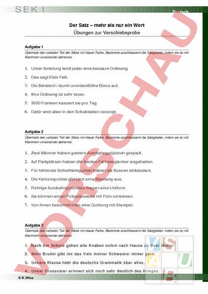 Deutsch Der Satz – mehr als nur ein Wort Übungen zur Verschiebeprobe Aufgabe 1 Übermale den verbalen Teil der Sätze mit blauer Farbe. Bestimme anschliessend die Satzglieder, indem sie du mit Klammern voneinander abtrennst. 1. Unter Anleitung lernt jeder eine bessere Ordnung. 2. Das sagt Elsie Falk. 3. Die Beraterin räumt unordentliche Büros auf. 4. Ihre Ordnung ist sehr teuer. 5. 3000 Franken kassiert sie pro Tag. 6. Dafür wird alles in den Schubladen versorgt. Aufgabe 2 Übermale den verbalen Teil der Sätze mit blauer Farbe. Bestimme anschliessend die Satzglieder, indem sie du mit Klammern voneinander abtrennst. 1. Zwei Männer haben gestern Autobahnpolizisten gespielt. 2. Auf Parkplätzen haben die beiden Fahrzeuglenker angehalten. 3. Für fehlende Sicherheitsgurten haben sie Bussen einkassiert. 4. Die Kantonspolizei gibt jetzt eine Warnung aus. 5. Richtige Autobahnpolizisten tragen eine Uniform. 6. Sie können einen Polizeiausweis mit Foto vorweisen. 7. Von ihnen bekommt man eine Quittung mit Stempel. Aufgabe 3 Übermale den verbalen Teil der Sätze mit blauer Farbe. Bestimme anschliessend die Satzglieder, indem sie du mit Klammern voneinander abtrennst. 1. Nach der Schule gehen alle Knaben sofort nach Hause zu ihrer Mutter. 2. Mein Bruder gibt mir das Velo meiner Schwester immer gern. 3. Unsere Klasse liebt die deutsche Grammatik über alles. 4. Unser Grossvater erinnert sich noch sehr deutlich des Krieges. K.Wiss Deutsch 5. Für diese Aufgaben bedürfen wir viel Muts. 6. Im Schwimmbad gehen sich die meisten Leute an der prallen Sonne bräunen. 7. Die Eltern machen sich immer wieder grosse Sorgen wegen ihrer braven Kinder. 8. Die Lehrer versuchen oft vergebens den Schülern die Satzlehre beizubringen. 9. Die lieben Schüler können vor lauter Grammatik schon bald nicht mehr schlafen. K.Wiss