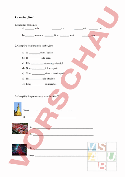 Le verbe ‚être 1. Ecris les pronomes a) suis esest b) sommes êtes sont est sont 2. Complète les phrases le verbe ‚être! a) Jedans léglise. b) Il à la gare. c) Elle dans un gratteciel. d) Nous à laeroport. e) Vous dans la boulangerie. f) Ils à la librairie. g) Elles au marché. 3. Complète les phrase avec le verbe ‚être! Vous Il Je Ils Elles Nous Elle Tu Le verbe ‚aller 1. Ecris les pronomes a) vais b) allons vas allezva vont 2. Complète les phrases le verbe ‚aller! h) Je dans léglise. i) Il à la gare. j) Elle dans un gratteciel. k) Nous à laeroport. l) Vous dans la boulangerie. m) Ils à la librairie. n) Elles au marché. 3. Complète les phrase avec le verbe ‚aller! Vous Il va vont Je Ils Elles Nous Elle Tu