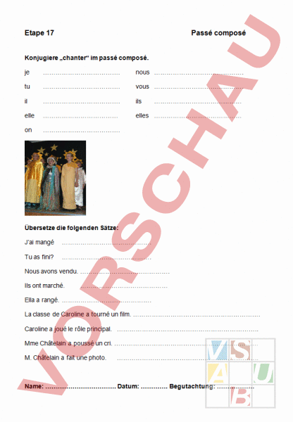 Etape 17 Passé composé Konjugiere „chanter im passé composé. je . nous . tu . vous . il . ils elle elles on . Übersetze die folgenden Sätze: Jai mangé . Tu as fini? . Nous avons vendu. . Ils ont marché. Ella rangé. . La classe de Caroline tourné un film. . Caroline joué le rôle principal. Mme Châtelain poussé un cri. M. Châtelain fait une photo. Name: . Datum: . Begutachtung: