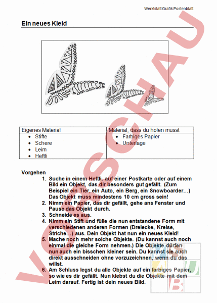 Werktstatt Grafik Postenblatt Ein neues Kleid Eigenes Material • Stifte • Schere • Leim • Heftli Material, dass du holen musst • Farbiges Papier • Unterlage Vorgehen 1. Suche in einem Heftli, auf einer Postkarte oder auf einem Bild ein Objekt, das dir besonders gut gefällt. (Zum Beispiel ein Tier, ein Auto, ein Berg, ein Snowboarder) Das Objekt muss mindestens 10 cm gross sein! 2. Nimm ein Papier, das dir gefällt, gehe ans Fenster und Pause das Objekt durch. 3. Schneide es aus. 4. Nimm ein Stift und fülle die nun entstandene Form mit verschiedenen anderen Formen (Dreiecke, Kreise, Striche) aus. Dein Objekt hat nun ein neues Kleid! 5. Mache noch mehr solche Objekte. (Du kannst auch noch einmal die gleiche Form nehmen.) Die Objekte dürfen nun auch ein bisschen kleiner sein. Du kannst sie auch direkt ausschneiden ohne vorzuzeichnen, wenn du das willst. 6. Am Schluss legst du alle Objekte auf ein farbiges Papier, so wie es dir gefällt. Nun klebst du die Objekte mit dem Leim darauf. Fertig ist dein neues Bild. Werktstatt Grafik Postenblatt Fotoschmuck Eigenes Material • Ein Foto mit Leerraum • Eigene Stifte • Heftli • Klebstreifen oder Leim Material, dass du holen musst • Ein weisses A4 Papier • Zugeschnittenes, durchsichtiges Papier • 5 zugeschnittene kleine Papierstücke zum Ausprobieren Vorgehen 1. Suche in einem Heftli verschiedene Formen und zeichne sie auf das weisse Blatt Papier (A4). (Verschiedene Linien, Blumen, Blätter, Buchstaben, Kreise) 2. Entscheide dich für eine oder zwei Formen, die dir besonders gut gefallen. 3. Nimm die 5 kleinen weissen Papiere und zeichne auf jedes die Formen anders auf. • Einmal sollen es immer mehr Formen werden. • Mit den Formen eine Linie machen • Formen wild verteilen • Die Formen zuerst eng zusammen und dann immer weiter auseinander zeichnen. • Die Formen sollen immer grösser oder immer kleiner werden. 4. Nimm nun das durchsichtige Papier, leg es auf dein Foto und klebe beides am Rand zusammen (mit Leim oder Klebstreifen). Mit einem schwarzen Stift kannst du jetzt auf das durchsichtige Papier deine Formen zeichnen. Werktstatt Grafik Postenblatt Schwarz und Weiss Eigenes Material • Leim • Schere Material, dass du holen musst • Ein schwarzes A4 Blatt • 3 weisse A4 Blätter • Eine Unterlage Vorgehen 1. Für diese Aufgabe brauchst du viele Formen. Entweder du nimmst ganz verschiedene Formen, (wie auf dem Bild) oder du nimmst immer dieselben (zum Beispiel Dreiecke) aber in verschiedenen Grössen. Entscheide dich für eine der beiden Möglichkeiten! 2. Schneide mindestens 20 Formen aus dem weissen Papier aus. 3. Lege nun alle weissen Teile auf das schwarze Blatt Papier. Lege die Teile zuerst möglichst regelmässig. Nimm sie dann wieder weg und versuche sie möglichst unregelmässig zu legen. Nimm sie wieder weg und versuch sie dann möglichst nahe beieinander zu legen. Nimm sie noch einmal weg und lege sie so, wie du möchtest. 4. Sobald du sie so gelegt hast, dass es ein Bild gibt, das dir wirklich gefällt, klebe die weissen Teile auf das schwarze Blatt. Werktstatt Grafik Postenblatt Schrift Eigenes Material • Verschiedene Stifte • Leim Material, dass du holen musst • 2 Mal weisses Papier (A4) • 1 Häuschenpapier • 1 zugeschnittenes weisses Papier Vorgehen • Nimm ein Heftli und schau verschiedene Schriften genau an. Kannst du Unterschiede erkennen? Wie unterscheiden sich die Schriften? • Wähle deine Lieblingsmarke aus. (Wenn du keine hast nimm die Marke, die auf deinen Schuhen oder auf deinem Pullover steht.) • Schreibe den Namen deiner Marke in vier verschiedenen Varianten auf das weisse und auf das Häuschenpapier. (Versuche die Schrift möglichst gross und dick zu machen.) Vielleicht willst du die Schriften auch verzieren? • Wähle nun die Schrift aus, die dir am besten gefällt und schreibe das Wort noch einmal auf das kleine weisse Papier, so schön wie du kannst. • Klebe dieses Papier nun mit dem Leim auf das zweite weisse A4 Papier. Werktstatt Grafik Postenblatt Verzierung Eigenes Material • Heftli • Stift Material, dass du holen musst • Weisses A4 Papier • 4 Mal zugeschnittenes weisses Papier (Postkartengrösse) Vorgehen 1. Schreibe auf das weisse Papier den Titel „Verzierungen. 2. Nimm ein Heftli und suche verschiedene Verzierungen. Welche Formen findest du in diesen Verzierungen? Schreibe und zeichne sie auf dein Papier. Zum Beispiel: „Herzli 3. Nimm nun ein weisses, kleines Papier und zeichne mit diesen Formen eine Verzierung. Dabei beginnst du am besten in einer Ecke auf deinem Blatt. (Wie auf dem Bild) 4. Wenn dir eine Verzierung nicht gefällt, kannst du einfach ein neues Papier nehmen und wieder beginnen. 5. Mache verschiedene Bilder. 6. Wenn du eine Verzierung gemacht hast, die dir besonders gut gefällt, darfst du aufhören. Schreibe bei diesem Blatt auf die Rückseite „Mein Lieblingsbild.