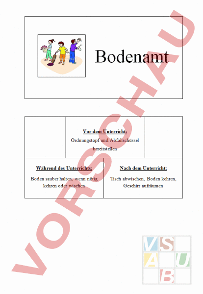 Bodenamt Vor dem Unterricht: Ordnungstopf und Abfallschüssel bereitstellen Während des Unterrichts: Nach dem Unterricht: Boden sauber halten, wenn nötig kehren oder wischen Tisch abwischen, Boden kehren, Geschirr aufräumen Herdamt Vor dem Unterricht: Nahrungsmittel bereitstellen Während des Unterrichts: Nach dem Unterricht: Herdschaltung überwachen Herd und Backofen säubern, Esstisch abräumen Trockenamt Vor dem Unterricht: Tücher austeilen Während des Unterrichts: Nach dem Unterricht: Geschirr abtrocknen und Geschirr trocknen und aufräumen, aufräumen Kontrolle nach Vollständigkeit Spülamt Vor dem Unterricht: Spülmittel und Spültücher austeilen Während des Unterrichts: Nach dem Unterricht: Arbeitsfläche säubern und Geschirr sortieren und spülen, Geschirr spülen Spüle und Arbeitsflächen säubern