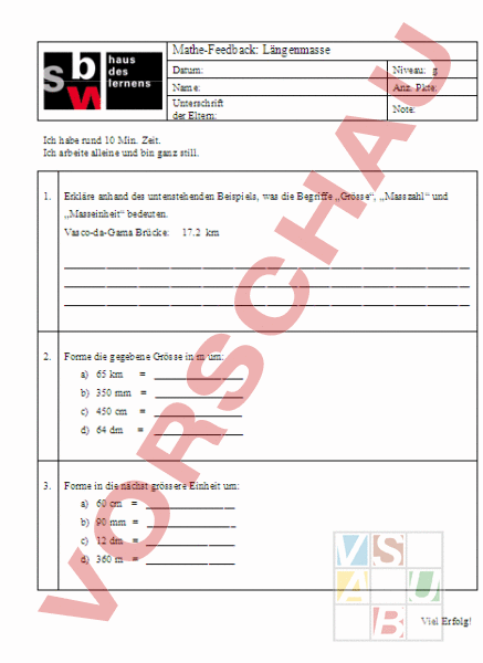 Mathe-Feedback: Längenmasse Datum: Niveau: Name: Unterschrift der Eltern: Anz. Pkte: Note: Ich habe rund 10 Min. Zeit. Ich arbeite alleine und bin ganz still. 1. Erkläre anhand des untenstehenden Beispiels, was die Begriffe „Grösse, „Masszahl und „Masseinheit bedeuten. Vasco-da-Gama Brücke: 17.2 km 2. Forme die gegebene Grösse in um: a) 65 km b) 350 mm c) 450 cm d) 64 dm 3. Forme in die nächst grössere Einheit um: a) 60 cm b) 90 mm c) 12 dm d) 360 Viel Erfolg!