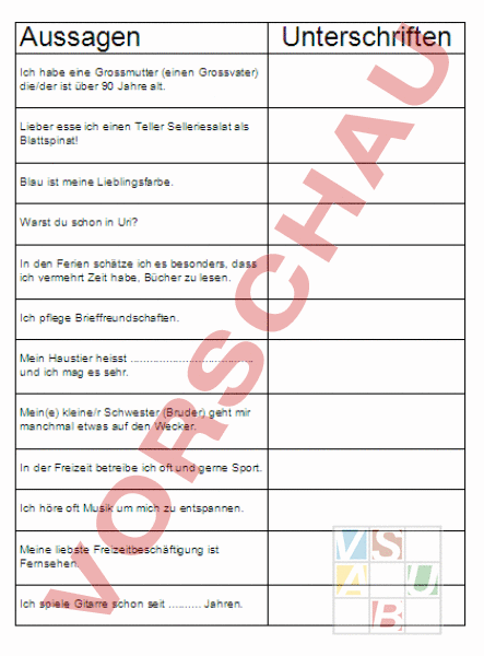 Schüler lernen einander besser kennen, indem sie andere Schüler befragen. Unterschriften können nur gesammelt werden, wenn die Aussage zutrifft.