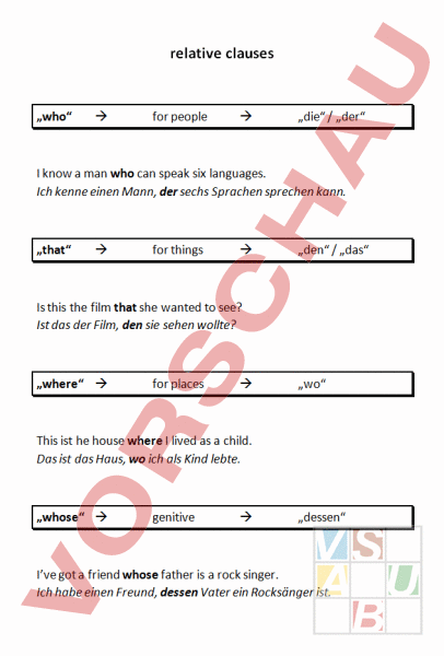 relative clauses „who for people „die „der know man who can speak six languages. Ich kenne einen Mann, der sechs Sprachen sprechen kann. „that for things „den „das Is this the film that she wanted to see? Ist das der Film, den sie sehen wollte? „where for places „wo This ist he house where lived as child. Das ist das Haus, wo ich als Kind lebte. „whose genitive „dessen Ive got friend whose father is rock singer. Ich habe einen Freund, dessen Vater ein Rocksänger ist.
