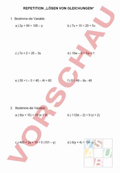 REPETITION „LÖSEN VON GLEICHUNGEN 1. Bestimme die Variable: a.) 2y 99 100 – b.) 7u 15 20 5u c.) 7x 2 20 – 3x d.) 10w – 9 7w 1 e.) 50 t – 5 40 – 4t 60 f.) 0 49 – 8x 48 2. Bestimme die Variable a.) 8(x 15) 10 (x 9) b.) 11(9z – 2) 9 (z 2) c.) 480 2y 18 5 (101 – y) d.) 8(y 4) 104 -y