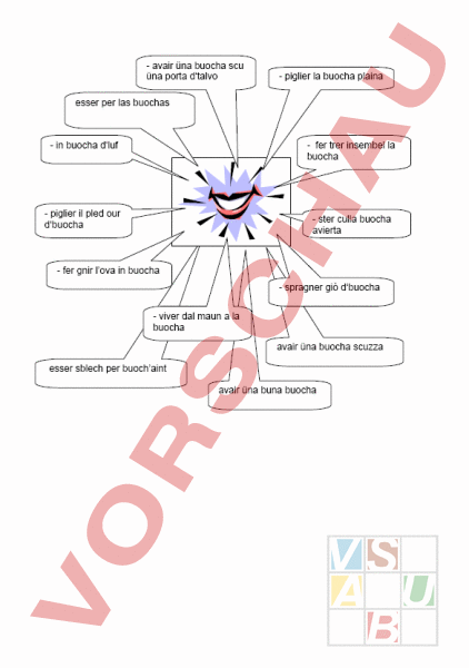- avair üna buocha scu üna porta d‘talvo piglier la buocha plaina esser per las buochas in buocha d‘luf fer trer insembel la buocha piglier il pled our d‘buocha ster culla buocha avierta fer gnir lova in buocha spragner giò d‘buocha viver dal maun la buocha avair üna buocha scuzza esser sblech per buochaint avair üna buna buocha gnir cotschen fin davous las uraglias güzzer las uraglias lascher pender las uraglias scriver qualchosa davous las uraglias clapper per las uraglias fer l‘uraglia da marchadaunt metter ün pülesch aint ill‘uraglia sclingir las uraglias der giò pel nes trer sü il nes avair ün bun nes ir adüna zievil nes fer il nes lung der üna schnaseda avair ögls nairs scu parmuoglias fer murlas scu ün giat a quatter ögls avair ün bun ögl volver ils ögls nu lascher our d‘ögl avair ögls dad aivla avair lögl pü grand cul bögl