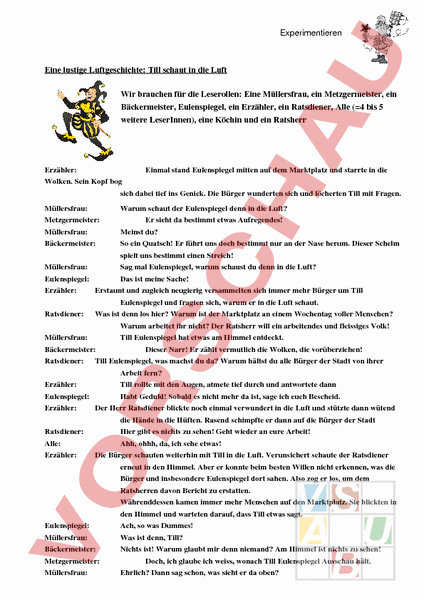 Experimentieren Eine lustige Luftgeschichte: Till schaut in die Luft Wir brauchen für die Leserollen: Eine Müllersfrau, ein Metzgermeister, ein Bäckermeister, Eulenspiegel, ein Erzähler, ein Ratsdiener, Alle (4 bis 5 weitere LeserInnen), eine Köchin und ein Ratsherr Erzähler: Einmal stand Eulenspiegel mitten auf dem Marktplatz und starrte in die Wolken. Sein Kopf bog sich dabei tief ins Genick. Die Bürger wunderten sich und löcherten Till mit Fragen. Müllersfrau: Metzgermeister: Müllersfrau: Bäckermeister: Warum schaut der Eulenspiegel denn in die Luft? Er sieht da bestimmt etwas Aufregendes! Meinst du? So ein Quatsch! Er führt uns doch bestimmt nur an der Nase herum. Dieser Schelm spielt uns bestimmt einen Streich! Müllersfrau: Sag mal Eulenspiegel, warum schaust du denn in die Luft? Eulenspiegel: Das ist meine Sache! Erzähler: Erstaunt und zugleich neugierig versammelten sich immer mehr Bürger um Till Eulenspiegel und fragten sich, warum er in die Luft schaut. Ratsdiener: Was ist denn los hier? Warum ist der Marktplatz an einem Wochentag voller Menschen? Warum arbeitet ihr nicht? Der Ratsherr will ein arbeitendes und fleissiges Volk! Müllersfrau: Till Eulenspiegel hat etwas am Himmel entdeckt. Bäckermeister: Dieser Narr! Er zählt vermutlich die Wolken, die vorüberziehen! Ratsdiener: Till Eulenspiegel, was machst du da? Warum hältst du alle Bürger der Stadt von ihrer Arbeit fern? Erzähler: Till rollte mit den Augen, atmete tief durch und antwortete dann Eulenspiegel: Habt Geduld! Sobald es nicht mehr da ist, sage ich euch Bescheid. Erzähler: Der Herr Ratsdiener blickte noch einmal verwundert in die Luft und stützte dann wütend die Hände in die Hüften. Rasend schimpfte er dann auf die Bürger der Stadt Ratsdiener: Hier gibt es nichts zu sehen! Geht wieder an eure Arbeit! Alle: Ahh, ohhh, da, ich sehe etwas! Erzähler: Die Bürger schauten weiterhin mit Till in die Luft. Verunsichert schaute der Ratsdiener erneut in den Himmel. Aber er konnte beim besten Willen nicht erkennen, was die Bürger und insbesondere Eulenspiegel dort sahen. Also zog er los, um dem Ratsherren davon Bericht zu erstatten. Währenddessen kamen immer mehr Menschen auf den Marktplatz. Sie blickten in den Himmel und warteten darauf, dass Till etwas sagt. Eulenspiegel: Ach, so was Dummes! Müllersfrau: Was ist denn, Till? Bäckermeister: Nichts ist! Warum glaubt mir denn niemand? Am Himmel ist nichts zu sehen! Metzgermeister: Doch, ich glaube ich weiss, wonach Till Eulenspiegel Ausschau hält. Müllersfrau: Ehrlich? Dann sag schon, was sieht er da oben? Experimentieren Metzgermeister: Erzähler: Eulenspiegel: Erzähler: Ich denke, das sollte jeder selbst herausfinden. Und ich war der Erste! Du musst es schon selbst herausfinden. Sag mir dann, was du meist und ich sage dir, ob es richtig ist! Plötzlich fasste Till sich an den Kopf und rief Soll mans für möglich halten? Verwundert blickten wieder alle in den Himmel und verstummten. Nach einiger Zeit wurden die Bürger so neugierig, dass sie Till allerlei Geschenke boten, nur um herauszufinden, warum er in die Luft schaute. Köchin: Ich bereite dir ein grosses Mahl vor, wenn du mir sagst, was du da siehst. Müllersfrau: Ich gebe dir meinen halben Hausrat, wenn du mir verrätst, warum du in den Himmel schaust! Alle: Nein, sag es mir! Du bekommst alles, was du dir wünscht! Erzähler: Während sich die Bürger stritten, warum Till in die Luft schaute und wem er sein Geheimnis nun als erstes verrät, kam der Ratsherr auf den Marktplatz. Ratsherr: Hallo Till, man erzählt sich, dass du etwas Neues am Himmel gefunden hast. Mich interessiert es sehr, was es Neues gibt. Kannst du es mir denn sagen? Erzähler: Till blickte weiterhin starr in die Luft und schnaufte dann Eulenspiegel: Sowas aber auch! Köchin: Sehen Sie Herr Ratsherr, wir stehen schon den halben Tag hier und er will es uns auch nicht sagen! Müllersfrau: Ja, und dabei haben wir ihm so viele Geschenke angeboten. Aber er reagiert gar nicht auf unsere gut gemeinten Angebote. Köchin: Sie müssen uns helfen. Wir werden nicht mehr arbeiten, solange wir nicht wissen, warum der Eulenspiegel in die Luft schaut! Erzähler: Der Herr Ratsherr erkannte, wie wichtig den Bürgern das Geheimnis war. Und obwohl er selbst erst seit einigen Minuten auf dem Marktplatz stand, wollte auch er unbedingt wissen, was hinter Eulenspiegels Blick in den Himmel steckte. Ratsherr: Nun Till, ich hätte da ein sehr gutes Angebot für dich. Wenn du uns verrätst, warum du in die Luft schaust, dann bekommst du einen hohen Titel. Erzähler: Nachdem Till wieder nur mit den Augen rollte und nichts sagte, begannen die Bürger, Till die Taschen voller Geschenke zu füllen und der Ratsherr verlieh ihm einen hohen Titel, wie er es zuvor versprochen hatte. Nun wurden die Bürger und der Ratsherr allerdings ungeduldig. Metzgermeister: Till, was ist nun? Köchin: Mein bestes Essen steht vor dir! Nun sag endlich, warum du nach oben schaust? Erzähler: Nachdem die Bürger nun laut über Till schimpften, lächelte er und sagte in einem freundlichen Ton Eulenspiegel: Ahh, endlich! Ich dachte schon, es geht nie mehr vorbei. Ich danke euch für die Geschenke und auch für eure Geduld. Ohne euch wäre es sehr langweilig auf dem Marktplatz gewesen. Experimentieren Erzähler: Als Till sich nun mit den Geschenken unter dem Arm aus der Stadt machen wollte, packte ihn der Bäckermeister zornig am Arm. Bäckermeister: Nun hast du unser Städtchen aber lange genug zum Narren gehalten. Sag uns jetzt endlich, warum du in die Luft geschaut hast! Eulenspiegel: Nein, ich habe euch nicht zum Narren gehalten. Ich fand es sogar ausgesprochen nett, dass ihr mit mir in die Luft geschaut habt! Köchin: Aber sag doch nun endlich, was du da oben gesehen hast! Eulenspiegel: Nun ja, ich denke, ich habe nicht viel mehr gesehen als ihr! Metzgermeister: Aber warum hast du dann nach oben geschaut? Eulenspiegel: Ich hatte ja keine andere Wahl. Auf dem Weg durch e