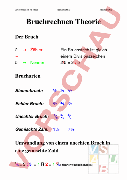 Andenmatten Michael Primarschule Mathematik Bruchrechnen Theorie Der Bruch 2 Zähler 5 Nenner Ein Bruchstrich ist gleich einem Divisionszeichen 2/5 2 5 Brucharten Stammbruch: Echter Bruch: Unechter Bruch: Gemischte Zahl: 9 8 1 6 5 8 7 7 Umwandlung von einem unechten Bruch in eine gemischte Zahl 3 5 3 1 2 1 23 Nenner wird beibehalten 5 Andenmatten Michael Primarschule Mathematik Umwandlung von einer gemischten Zahl in einen unechten Bruch 1 23 1 3 3 2 53 Ganze Zahl den Nenner den Zähler Nenner wird beibehalten Brüche erweitern Brüche erweitern bedeutet, Zähler und Nenner mit der gleichen Zahl multiplizieren. 2 3 5 3 6 15 Brüche kürzen Brüche kürzen bedeutet, Zähler und Nenner mit der gleichen Zahl dividieren. Ich suche den ggT von Zähler und Nenner. 4 4 1 Andenmatten Michael 12 4 Primarschule Mathematik 3 Kürzen von Brüchen mit grossen Zahlen Beim Kürzen von Brüchen mit grossen Zahlen verwende ich die Primfaktorenzerlegung. 216 2 2 2 3 3 3 300 2 2 3 5 5 25 18 Nachdem ich Zähler und Nenner in ihre Primfaktoren zerlegt habe, streiche ich die Primfaktoren, welche bei beiden vorkommen. Die restlichen multipliziere ich und erhalte so direkt den gekürzten Bruch. Brüche vergleichen Wenn man zwei Brüche vergleichen möchte, muss man sie zuerst auf denselben Nenner bringen und erst dann kann ich sie vergleichen. Den gleichen Nenner finde ich heraus, in dem ich das kgV der beiden Nenner suche. Ich will die beiden Brüche kgV von 5 und 7 ist 35. 3 5 und 47 vergleichen Andenmatten Michael 3 7 5 7 3 Primarschule 21 4 5 35 7 5 Mathematik 20 35 4 Also: 5 7 Gleichnennerig machen bei Brüchen mit grossen Zahlen 1 144 und 1228 Hier muss ich ebenfalls das kgV von 144 und 228 suchen. Wiederum verwendet man hier die Primfaktorenzerlegung. 144 2 2 2 2 3 3 228 2 2 3 19 kgV 144, 228 2 2 3 2 2 3 19 2736 Andenmatten Michael Primarschule Mathematik Die Primfaktoren welche bei beiden vorkommen nehme ich nur einmal und multipliziere diese mit allen anderen Faktoren. 1 144 19 19 19 1 2736 228 12 12 12 2736 Grundoperationen mit Brüchen Addition Beim Addieren von zwei Brüchen ist es wichtig, dass man beide Nenner auf den gleichen Wert bringt gleichnennerig machen 1 8 1 3 3 24 8 24 11 24 Andenmatten Michael Primarschule Mathematik Der Nenner wird beibehalten und die Zähler werden addiert. Ist das Ergebnis ein unechter Bruch, wird dieser in eine gemischte Zahl umgewandelt und wenn möglich noch gekürzt. Addition von gemischten Zahlen Bei der Addition von gemischten Zahlen zählt man zuerst die ganzen zusammen. Dann macht man die Brüche „gleichnennerig. Zählt die Zähler zusammen und behält den Nenner bei. 32 325 11 5 /12 Subtraktion 3 8 11 /12 /12 /12 Andenmatten Michael Primarschule Mathematik Gleich wie die Addition funktioniert auch die Subtraktion. Zuerst „gleichnennerig machen. Dann wird ebenfalls der Nenner beibehalten und die Zähler vom ersten Bruch subtrahiert. 4 5 1 6 24 5 30 30 19 30 Subtraktion von gemischten Zahlen Auch hier werden zuerst die ganzen Zahlen subtrahiert. Beispiel: 2 27 /5 4 9 /5 27 9 18 2 4 /5 /5 geht nicht Man nimmt von den Ganzen eines weg und verwandle dieses in Fünftel und zähle sie zu den 2 /5 dazu. Andenmatten Michael Primarschule 5 18 17 7 4 Mathematik 5 1 /5 2 7 /5 /5 /5 3 3 /5 /5 /5 Schlussantwort: 17 /5 Multiplikation von einem Bruch mit einer ganzen Zahlen Beispiel: 2 6 12 9 3 1 1 1 9 9 3 Man multipliziert die ganze Zahl mit dem Zähler und behält den Nenner bei. Sofern der neue Bruch ein unechter Bruch ist, verwandelt man ihn in eine gemischte Zahl und kürzt ihn noch. Multiplikation von Brüchen Beispiel: 2 4 /5 7 Andenmatten Michael 2 4 Primarschule 2 4 Mathematik 8 5 5 7 7 35 Bei der Multiplikation von Brüchen werden die Zähler und die Nenner miteinander multipliziert und wenn möglich gekürzt. Multiplikation von gemischten Zahlen 2 4 Beispiel: 2 /5 4 7 1. Die gemischten Zahlen werden in unechte Brüche umgewandelt. 2 12 4 2 /5 /5 32 4 7 /7 2. Danach werden die Brüche normal multipliziert. 12 31 5 7 12 32 384 34 10 5 7 35 35 Andenmatten Michael Primarschule Mathematik Dividieren einer ganzen Zahl von einem Bruch 2 Beispiel: /12 2 2 1 2 12 12 Lässt sich die ganze Zahl durch den Zähler dividieren. Tut man dies. Der Nenner wird beibehalten. 3 Beispiel: /12 2 3 :2 Geht nicht! 12 Ich verwandle die ganze Zahl in einen Bruch. 3 2 3 1 3 1 Andenmatten Michael Primarschule Mathematik 12 1 12 2 24 8 Ich dividiere zwei Brüche indem ich den zweiten Bruch stürze und ihn multipliziere. Dividieren zweier gemischter Zahlen 2 4 Beispiel: 27 /5 9 /5 Man verwandelt die gemischten Zahlen in unechte Brüche und dividiert die Brüche, indem man den zweiten Bruch stürzt und ihn multipliziert. 2 27 /5 137 137 49 5 5 39 2 49 4 /5 49 9 /5 /5 137 5 685 195 2 5 49 245 245 Nicht vergessen den unechten Bruch in eine gemischte Zahl umzuwandeln und zu kürzen. Andenmatten Michael Primarschule Mathematik Dezimalbrüche in Brüche verwandeln Beispiel: 75,4 in einen Bruch verwandeln. 1. Schritt: Wir tragen 75,4 in die Stellentafel ein. /10 7 5 4 /100 /1000 2. Schritt: Bruch ablesen 4 75 /10 3. Schritt: Kürzen 2 75 /5 Dezimalbrüche von Grössen in eine grössere Masseinheit umwandeln und als gemischte Zahl angeben Beispiel: 354 Liter in Hektoliter umwandeln Andenmatten Michael Primarschule Mathematik 1. Schritt: 354 in die Stellentafel eintragen hl /10 /100 3 5 4 2. Schritt: Gemischte Zahl ablesen 54 3 /100 3. Schritt: kürzen 54 27 3 /100 3 /50 /1000