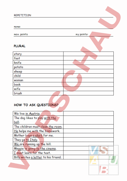 REPETITION name: max. points PLURAL story foot knife potato sheep child woman book wife brush HOW TO ASK QUESTIONS? We live in Austria. The dog likes to play with the ball. The children must clean the room. He helps me with the homework. Mother buys shirt for me. They go to Italy. We are running up the hill. Maggie is going to the cinema. must learn for the test. Billy writes letter to his friend. my points: