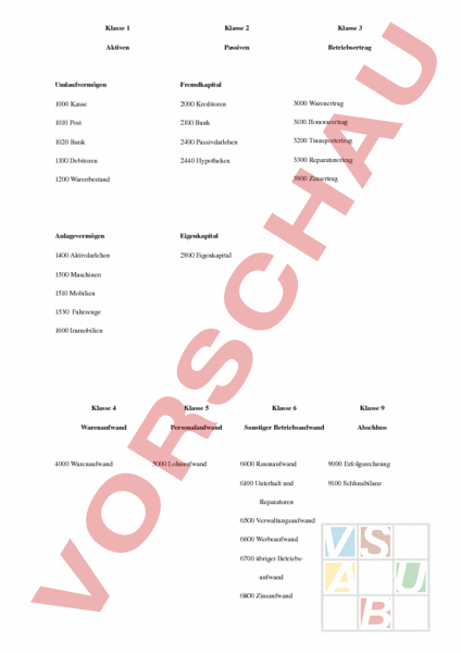 Klasse 1 Klasse 2 Klasse 3 Aktiven Passiven Betriebsertrag Umlaufvermögen Fremdkapital 1000 Kasse 2000 Kreditoren 3000 Warenertrag 1010 Post 2100 Bank 3100 Honorarertrag 1020 Bank 2400 Passivdarlehen 3200 Transportertrag 1100 Debitoren 2440 Hypotheken 3300 Reparaturertrag 3800 Zinsertrag 1200 Warenbestand Anlagevermögen Eigenkapital 1400 Aktivdarlehen 2800 Eigenkapital 1500 Maschinen 1510 Mobilien 1530 Fahrzeuge 1600 Immobilien Klasse 4 Klasse 5 Klasse 6 Klasse 9 Warenaufwand Personalaufwand Sonstiger Betriebsaufwand Abschluss 4000 Warenaufwand 5000 Lohnaufwand 6000 Raumaufwand 9000 Erfolgsrechnung 6100 Unterhalt und 9100 Schlussbilanz Reparaturen 6500 Verwaltungsaufwand 6600 Werbeaufwand 6700 übriger Betriebs aufwand 6800 Zinsaufwand 6900 Abschreibungen