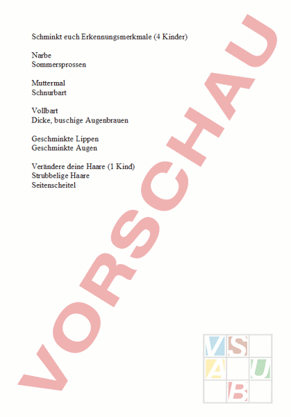 Schminkt euch Erkennungsmerkmale (4 Kinder) Narbe Sommersprossen Muttermal Schnurbart Vollbart Dicke, buschige Augenbrauen Geschminkte Lippen Geschminkte Augen Verändere deine Haare (1 Kind) Strubbelige Haare Seitenscheitel