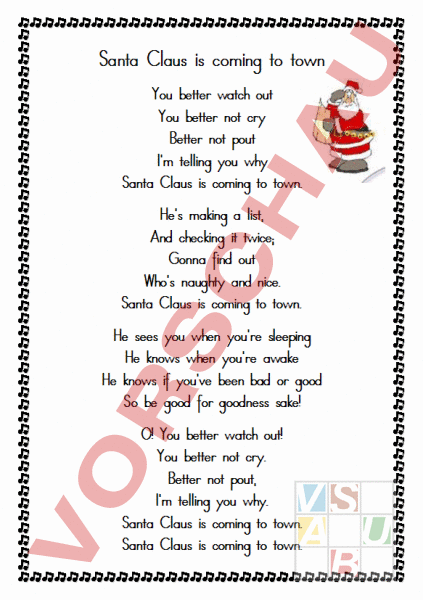Santa Claus is coming to town You better watch out You better not cry Better not pout Im telling you why Santa Claus is coming to town. He making list, And checking it twice; Gonna find out Who naughty and nice. Santa Claus is coming to town. He sees you when youre sleeping He knows when youre awake He knows if youve been bad or good So be good for goodness sake! O! You better watch out! You better not cry. Better not pout, Im telling you why. Santa Claus is coming to town. Santa Claus is coming to town.
