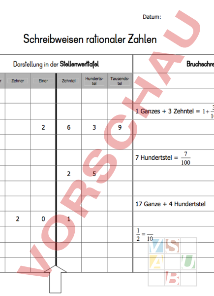 Die Schüler üben die verschiedenen Darstellungsweisen rationaler Zahlen anhand der Stellenwerttafel