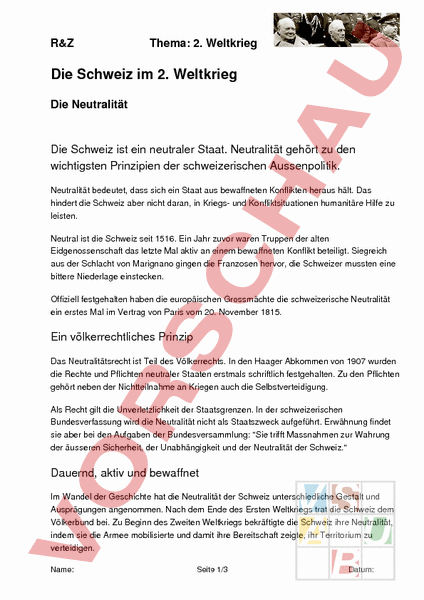 R&Z Thema: 2. Weltkrieg Die Schweiz im 2. Weltkrieg Die Neutralität Die Schweiz ist ein neutraler Staat. Neutralität gehört zu den wichtigsten Prinzipien der schweizerischen Aussenpolitik. Neutralität bedeutet, dass sich ein Staat aus bewaffneten Konflikten heraus hält. Das hindert die Schweiz aber nicht daran, in Kriegs und Konfliktsituationen humanitäre Hilfe zu leisten. Neutral ist die Schweiz seit 1516. Ein Jahr zuvor waren Truppen der alten Eidgenossenschaft das letzte Mal aktiv an einem bewaffneten Konflikt beteiligt. Siegreich aus der Schlacht von Marignano gingen die Franzosen hervor, die Schweizer mussten eine bittere Niederlage einstecken. Offiziell festgehalten haben die europäischen Grossmächte die schweizerische Neutralität ein erstes Mal im Vertrag von Paris vom 20. November 1815. Ein völkerrechtliches Prinzip Das Neutralitätsrecht ist Teil des Völkerrechts. In den Haager Abkommen von 1907 wurden die Rechte und Pflichten neutraler Staaten erstmals schriftlich festgehalten. Zu den Pflichten gehört neben der Nichtteilnahme an Kriegen auch die Selbstverteidigung. Als Recht gilt die Unverletzlichkeit der Staatsgrenzen. In der schweizerischen Bundesverfassung wird die Neutralität nicht als Staatszweck aufgeführt. Erwähnung findet sie aber bei den Aufgaben der Bundesversammlung: Sie trifft Massnahmen zur Wahrung der äusseren Sicherheit, der Unabhängigkeit und der Neutralität der Schweiz. Dauernd, aktiv und bewaffnet Im Wandel der Geschichte hat die Neutralität der Schweiz unterschiedliche Gestalt und Ausprägungen angenommen. Nach dem Ende des Ersten Weltkriegs trat die Schweiz dem Völkerbund bei. Zu Beginn des Zweiten Weltkriegs bekräftigte die Schweiz ihre Neutralität, indem sie die Armee mobilisierte und damit ihre Bereitschaft zeigte, ihr Territorium zu verteidigen. Name: Seite 1/3 Datum: R&Z Thema: 2. Weltkrieg Neutralität im Wandel Nach dem Zweiten Weltkrieg nannte der Bundesrat Neutralität in einem Atemzug mit Solidarität. Das bedeutet, dass die Schweiz an friedensfördernden Aktionen im Ausland teilnehmen kann. So etwa 1953 in Korea zur Überwachung des Waffenstillstands zwischen Nord und Süd. Oder in den 90er Jahren bis heute im Balkan. Stärker als bisher betonte die Regierung die Kooperation. So hält der Bundesrat ein Engagement im Rahmen der vom Militärbündnis NATO initiierten „Partnerschaft für den Frieden als mit der schweizerischen Neutralität vereinbar, „da kein NATOBeitritt gefordert wird und keine Verpflichtung zum militärischen Beistand im Falle von Konflikten entsteht. Was ist unter diesen Begriffen zu verstehen? Neutralität: Seit , aber offiziell erst seit im Vertrag von festgehalten. Rechte: Pflichten: Zu Beginn des 2. Weltkrieges mobilisierte die Schweiz die um ihr Gebiet zu Die Schweiz gehört der NATO an: Name: ja Seite 2/3 nein Datum: R&Z Thema: 2. Weltkrieg Falls ein NATOMitglied angegriffen wird, muss die Schweiz eingreifen? ja nein Solidarität: Auslandseinsätze des Schweizer Militärs: Name: Seite 3/3 Datum: