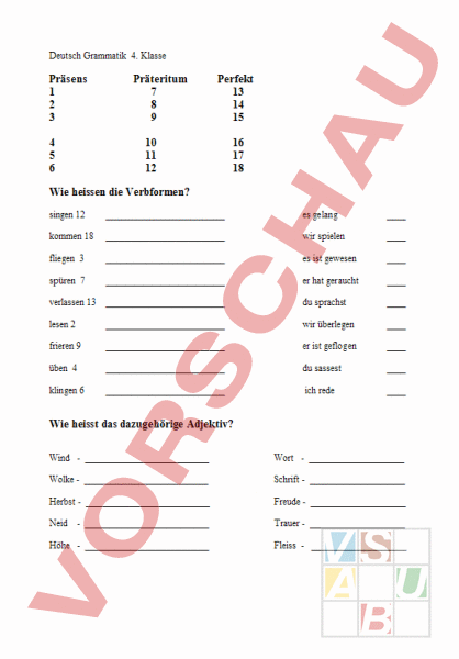 Deutsch Grammatik 4. Klasse Präsens 1 2 3 4 5 6 Präteritum 7 8 9 Perfekt 13 14 15 10 11 12 16 17 18 Wie heissen die Verbformen? singen 12 es gelang kommen 18 wir spielen fliegen 3 es ist gewesen spüren 7 er hat geraucht verlassen 13 du sprachst lesen 2 wir überlegen frieren 9 er ist geflogen üben 4 du sassest klingen 6 ich rede Wie heisst das dazugehörige Adjektiv? Wind Wort Wolke Schrift Herbst Freude Neid Trauer Höhe Fleiss