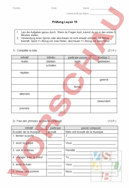 Punkte: Note: Name: Unterschrift der Eltern: Prüfung Leçon 15 1. Lies die Aufgaben genau durch. Wenn du Fragen hast, kannst du sie in den ersten 5 Minuten stellen. 2. Verwendung eines Spicks oder abschauen ist nicht erlaubt und wird mit Abzug bestraft. Spick Abzug von zwei Noten, abschauen Abzug von einer Note! 1) Complète la liste infinitif rester (21 P.) Infinitiv bleiben schlafen participe passé resté Partizip 2 geblieben répéter gelernt fermé attendre bewundert prendre 2) Fais des phrases au passé composé. (12 P.) infinitif Ecouter de la musique 1. fermer la porte participe écouté passé composé Elles ont écouté de la musique. J 2. avoir la grippe Vous 3. voir le château Pierette 4. voyager avec la soeur Tu 5. lever la main Vous 6. choisir une pomme Nous 3) Mets la forme du verbe pronominal. (14 P.) (se laver) (sintéresser) Vous vous lavez. Toi, tu (se réveiller) Nous (se préparer) Les enfants (se regarder) dans la glace Paul (se saluer) Anna et Louis (se tromper) Vous (samuser) bien Elles (shabiller) Tu 4) Voici ce que la mère noté pour Sandra - (5 P.) acheter des tomates faire les devoirs arroser les fleurs sur le balcon téléphoner à la grand-mère apprendre tes mots dallemand. Quand la mère rentre, elle demande à Sandra Tu as Tu Tu Tu Tu 5) Quelle heure est-il (7 P.) 6.15 Il est six heures et quart. 9.30 Il_ 6.45 12.00 1.45 1.20 5.35 8.05 6) Complète les dessins. Dix heures moins dix Minuit et quart (6 P.) six heures vingt sept heures et demie trois heures huit heures moins vingt