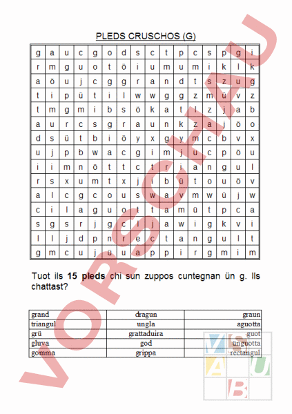 PLEDS CRUSCHOS (G) ö ö ü ü ö ö ü ö ö ö ü ö w ü ü ü Tuot ils 15 pleds chi sun zuppos cuntegnan ün g. Ils chattast? grand triangul grü gluva gomma dragun ungla grattaduira god grippa graun aguotta guot ünguotta rectangul