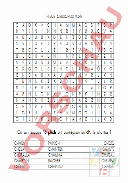 PLEDS CRUSCHOS (CH) A V H M A D C A V V C V H K C C O Ö N V O N N V H Ü H Ü C V C K C M N I Cò sun zuppos 18 pleds chi cuntegnan ün ch. Ils chattast? CHAUN CHESA CHÜRALLA CHARTUN CHÜNA PAINCH CHANTUN CHAMMA BACHER CHAPLINA CHEJEL CHASTE CHUCAL CHEVRA CHAMIN CHARTA CHAMEIL CHAVRIÖL