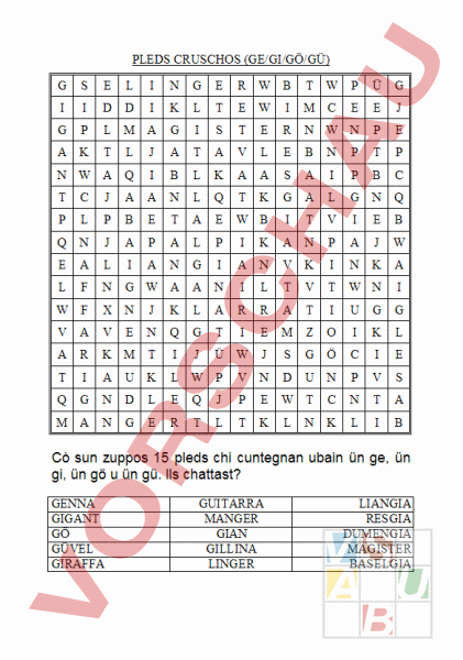 PLEDS CRUSCHOS (GE/GI/GÖ/GÜ) W W Ü W C A W W W W W M Ü Ö W W A Cò sun zuppos 15 pleds chi cuntegnan ubain ün ge, ün gi, ün gö ün gü. Ils chattast? GENNA GIGANT GÖ GÜVEL GIRAFFA GUITARRA MANGER GIAN GILLINA LINGER LIANGIA RESGIA DUMENGIA MAGISTER BASELGIA