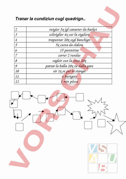 Tranar la cundiziun cugl quadrign 2 3 4 5 6 7 8 9 10 11 12 tutgier 3x igl canaster da basket scliviglier 4x sur la stgelera trapuntar 20x segl banchign 5x cursa da slalom 15 puntettas correr 2 rundas sagleir cun la soua 20x pattar la balla 20x ve dalla pare eir 1x se per la stanga 6 burtgets 1 min pôssa